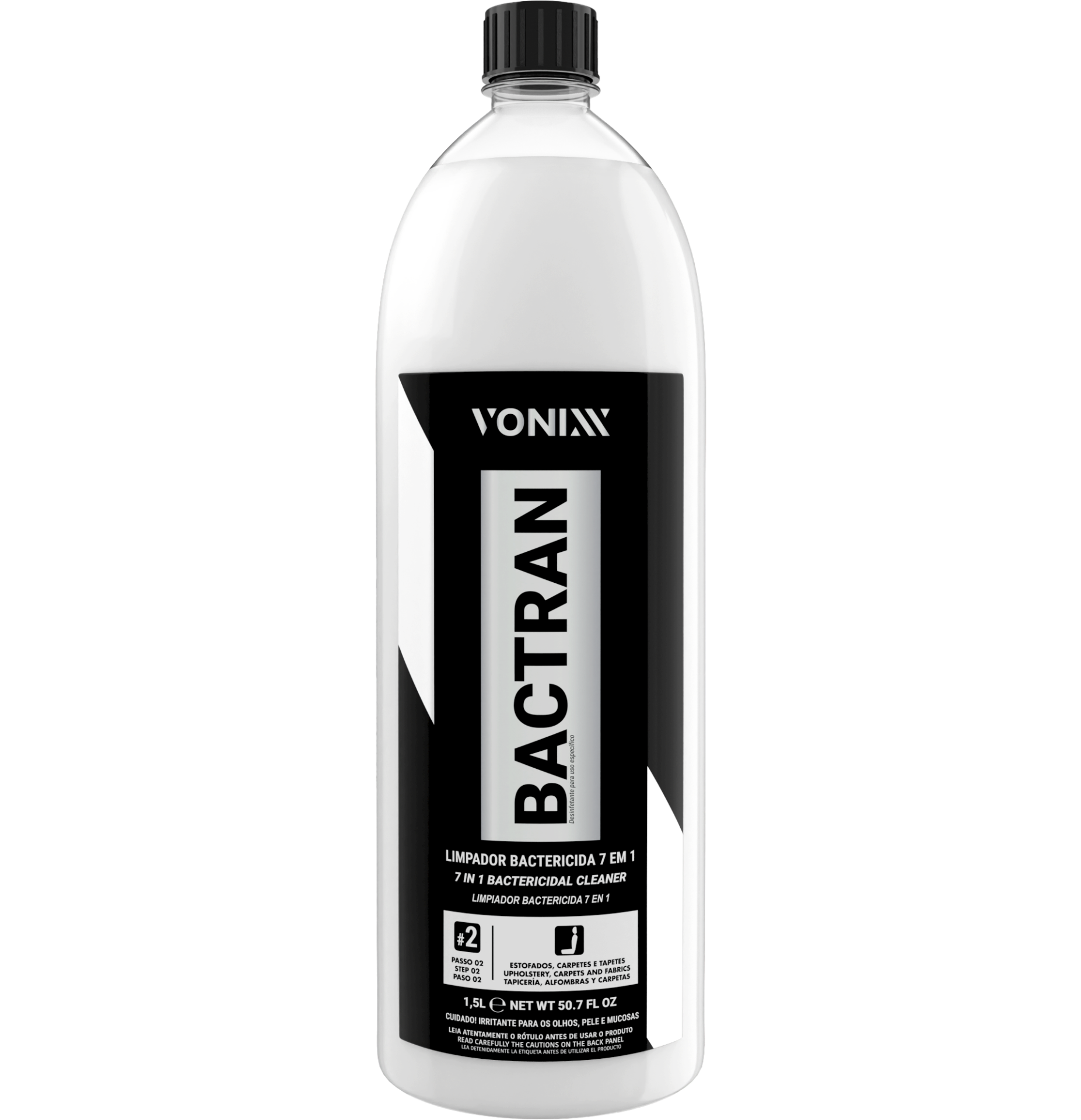 Bactran é um limpador bactericida ultra concentrado de alta performance e baixa espumação, desenvolvido para limpeza profissional de estofados, carpetes e tapetes. Seu uso é indicado com extratoras. Sua fórmula contém tensoativos especiais que agem em sinergia com o peróxido de hidrogênio e remove facilmente os mais diversos tipos de sujeira, em especial manchas de sangue, suco, café e bolores, além de eliminar fungos e bactérias.
