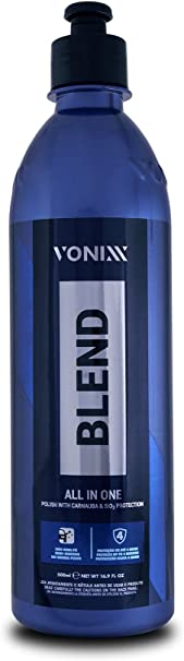 Blend All In One é um polidor de etapa única com proteção, que alia o brilho da carnaúba e a resistência cerâmica do SiO2, promovendo também hidrorrepelência na pintura. Seu alto poder de corte elimina riscos e swirls médios a severos (comparável a marcas de lixa P2000 ou mais finas), deixando um ótimo acabamento ao mesmo tempo.