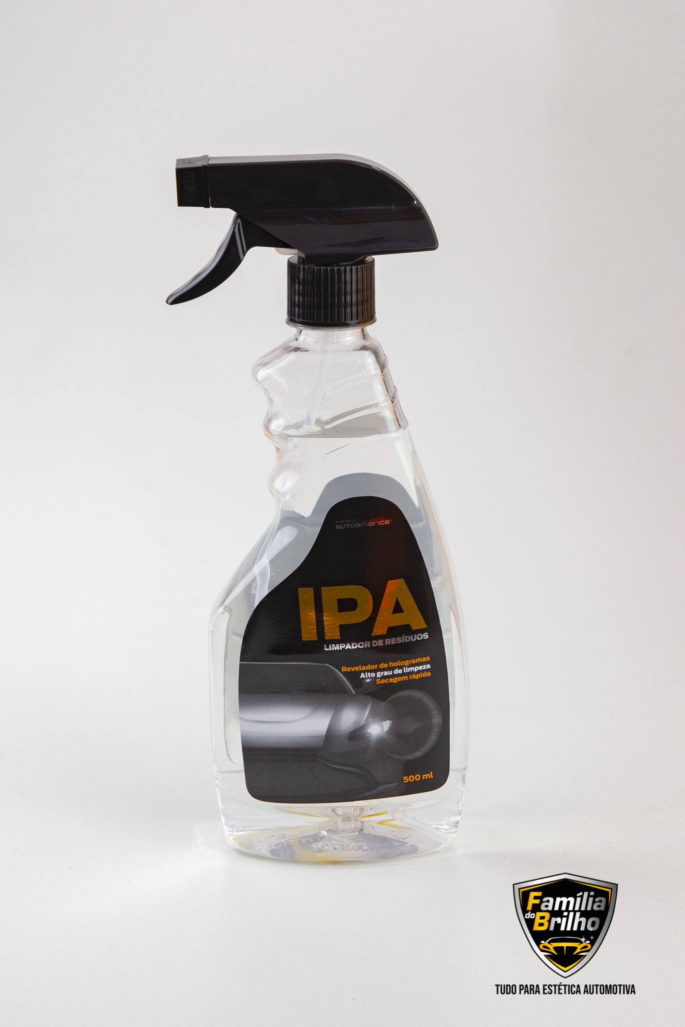 IPA, o limpador de resíduos da Autoamerica, atua na limpeza e descontaminação de superfícies pintadas, plásticos e vidros. Seu uso é indicado para examinar a peça entre as etapas de polimento automotivo e aplicação de ceras, selantes e revestimentos cerâmicos.