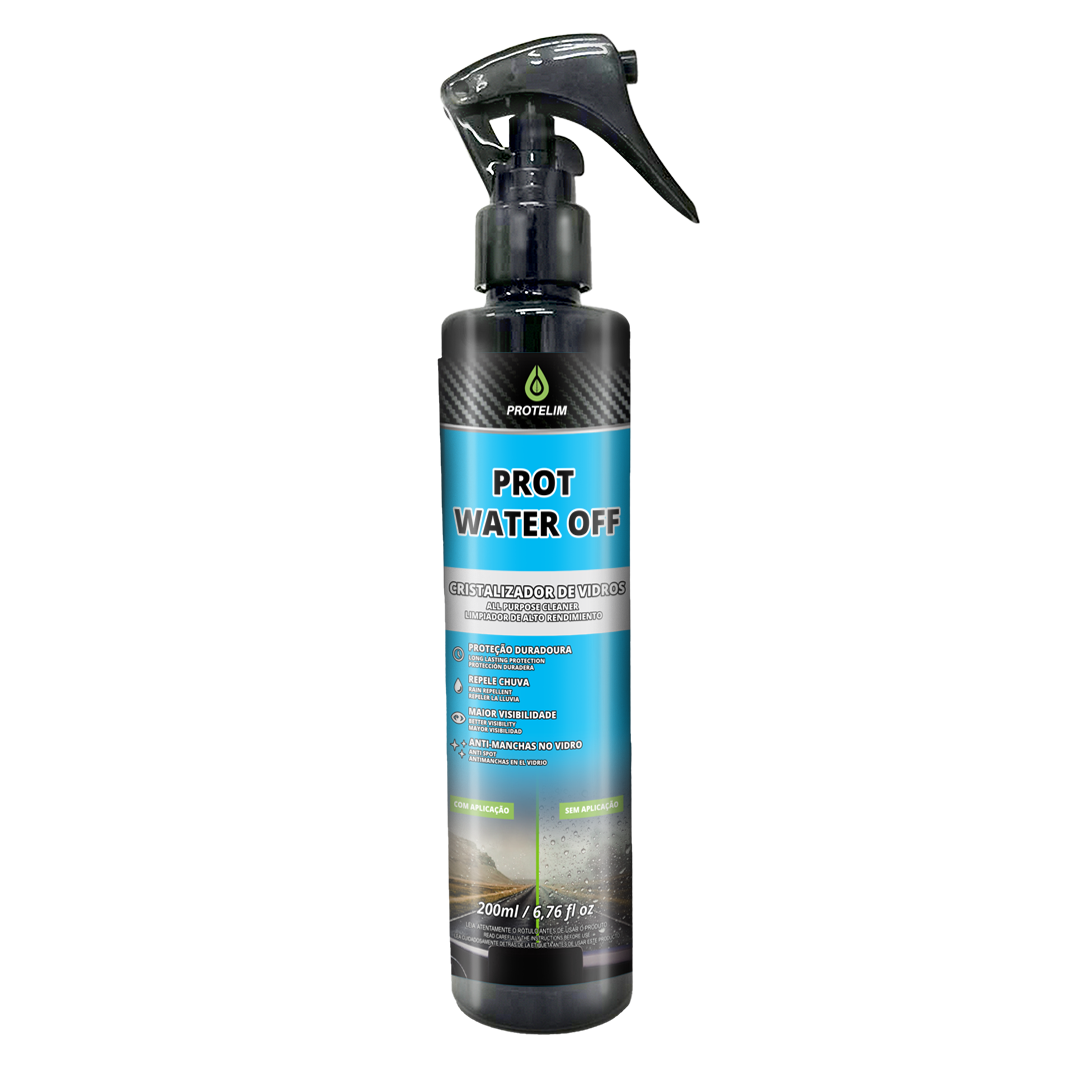 PROT WATER OFF é um cristalizador de vidros em geral. Sua fórmula inovadora à base de água cria uma película invisível sobre o vidro.Quando usado em vidros automotivos, de aviações e náuticos, proporciona maior segurança ao condutor, pois aumenta a visibilidade, incrivelmente em velocidades acima de 80 km/h em dias chuvosos.Em vidros Prediais, como boxes, janelas, fachadas, entre outros, facilita a remoção da sujeira e melhora o aspecto visual dos vidros, proporcionando facilidade e redução na limpeza.