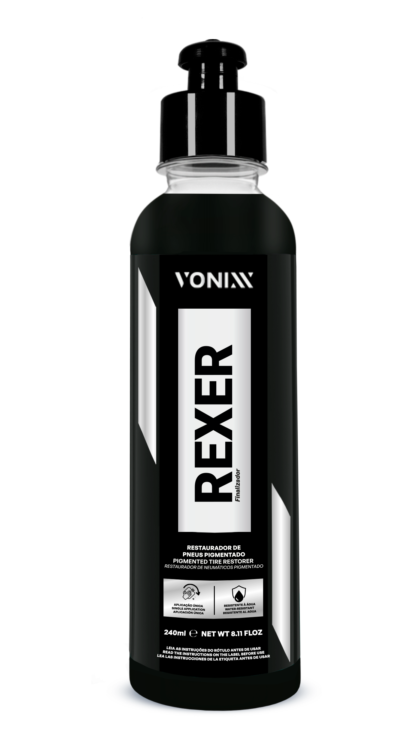 REXER é um restaurador de pneus pigmentado, de alta durabilidade, que forma um filme seco, brilhante e resistente à água em uma única aplicação.