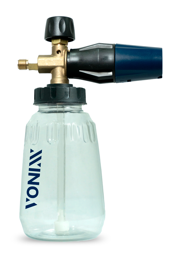 A válvula superior do canhão de espuma controla a quantidade de mistura que é dispensada.