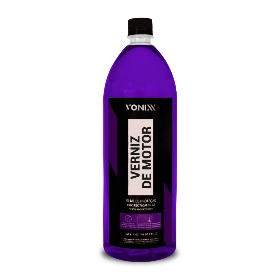 VERNIZ DE MOTOR, protege, dá brilho e renova todas as superfícies existentes no cofre do motor, como partes metálicas, plásticas, superfícies pintadas e mangueiras de borracha. O produto forma um filme levemente lubrificado que penetra em locais difíceis e adere em todas as superfícies citadas. Verniz de motor é resistente a altas temperaturas e tem durabilidade de até seis meses. Também pode ser utilizado em chassi e caixas de rodas, proporcionado os mesmos benefícios de sua aplicação no motor.